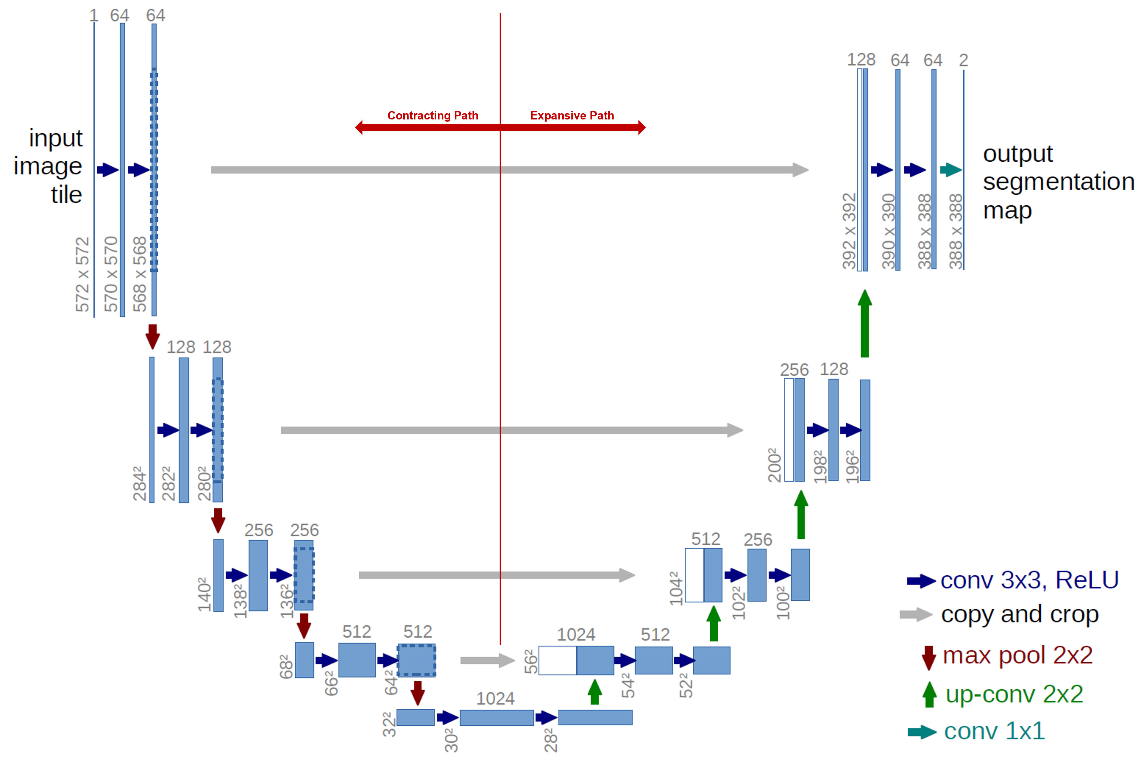 - 왼쪽의 Contracting path, 오른쪽의 Expansive path가 대칭적인 구조를 이루어 Encoder-Decoder 구조와 같이 이미지에 대한 Downsampling, Upsampling을 수행합니다.
