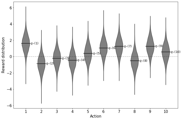 본 Testbed에서는 10개의 슬롯머신이 있을 때 Greedy method와 $\epsilon$-greedy method 의 성능을 확인해봅니다. 여기서 Optimal value $(q_*)$가 $N(0, 1)$ 인 정규분포를 따른다고 가정합니다. 이 분포로부터 각 슬롯머신의 실제 Value 값이 추출됩니다. 그리고 각 슬롯머신을 작동시키면 $N(q_*(a), 1)$인 분포를 따르는 Reward를 반환합니다. 아래의 그림은 각 슬롯머신(Action) 당 Reward의 분포를 그린 것입니다.