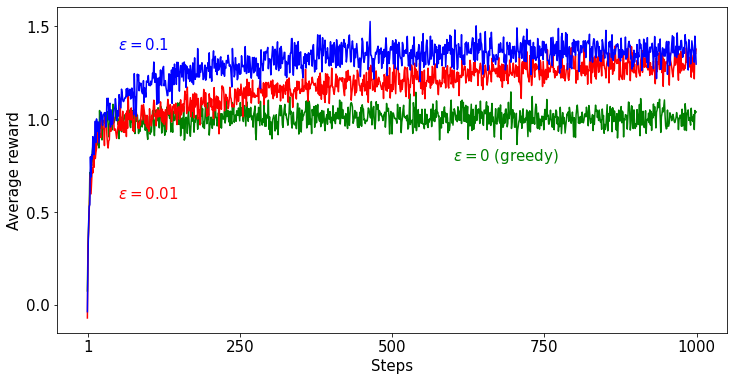 $\epsilon$ 이 0.1일때와 0.01 일 때를 비교해보면, 0.1일 때가 초반에 더 높은 Reward를 보여주지만 Reward들을 거의 정확히 예측하더라도 10 % 의 확률로 Exploration을 하기 때문입니다. $\epsilon=0.01$ 일 때는 Exploration 확률이 낮아서 Reward들을 정확히 예측하는 데 오래 걸리지만, 정확히 예측하게 되면 1 %의 확률로 Exploitation을 하기 때문에 장기적으로 보았을 때 $\epsilon=0.1$ 보다 Reward가 더 좋아지게 됩니다.