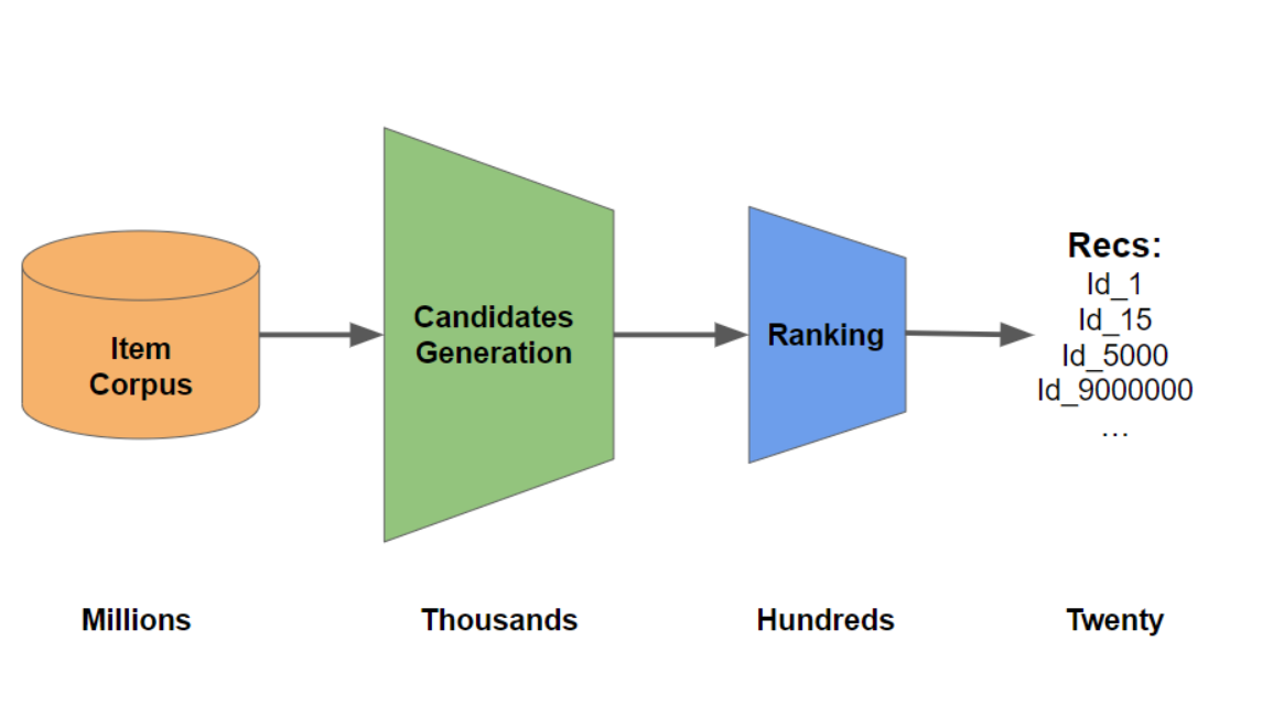 거대 인터넷 플랫폼이 등장함에 따라 수 백만명 이상의 사용자에게 수 천만 개 이상의 아이템 중에서 소비할만한 아이템을 추천하는 것은 상당한 자원을 필요로합니다. 특히, 딥러닝 모델과 같이 많은 연산이 필요한 기술을 사용하여, 각 사용자 별로 수 천만 개의 아이템에 대한 선호도를 계산한다면 응답 시간 지연은 더욱 커지게됩니다. 아마존 연구에 따르면 0.1초의 페이지 로딩 지연이 약 1%의 매출 감소로 이어진다고 할 정도로 추천 속도는 중요한 문제입니다. 이 문제를 해결하기 위해, 유튜브, 넷플릭스, 아마존과 같은 거대 플랫폼에서는 Multi-Stage 추천 시스템[1,2]을 주로 활용하여 추천 성능을 향상시키고 있습니다.