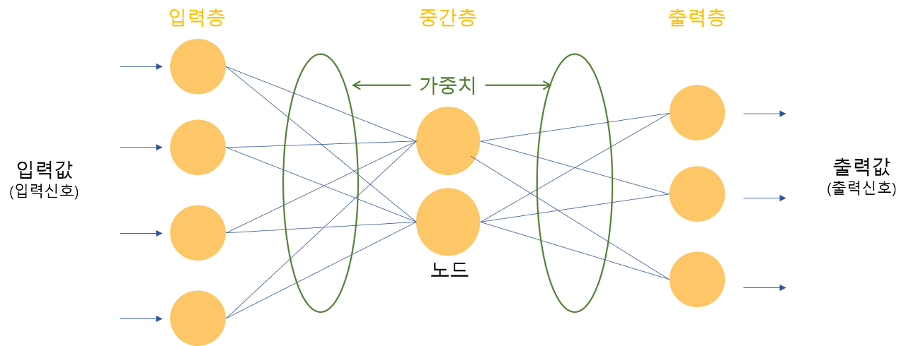 이름에서부터 알 수 있듯이 사람 뇌에 있는 신경세포의 신호전달 과정을 모방하여 구성한 네트워크입니다. 사람의 뇌의 뉴런들이 특정 임계값(Threshold) 이상의 자극을 받으면 결과 신호를 전달하듯 Input data를 받으면 가중치(Weight)에 따라 Output data를 출력한다는 구조입니다.