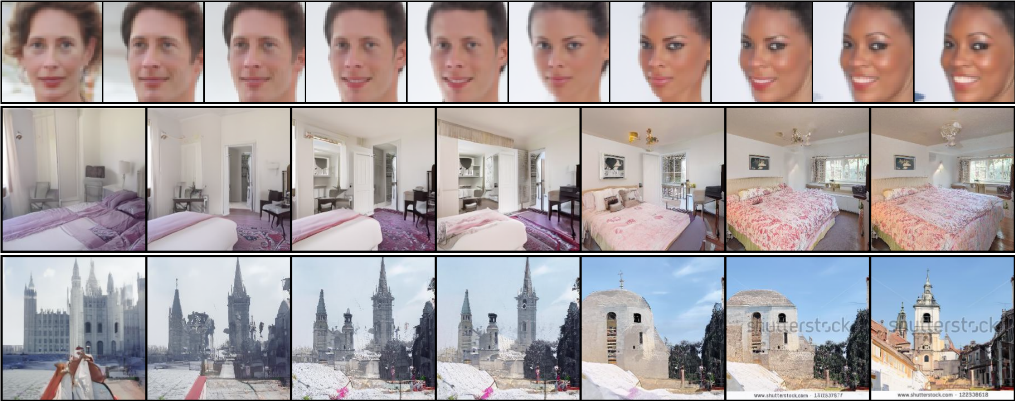 또한, 노이즈가 제거되어 Reverse Process가 deterministic 해진 덕분에 latent space로부터의 interpolation 또한 가능해졌습니다. 아래 그림을 보면, latent space 간의 interpolation이 더 자연스러워진 것을 확인할 수 있습니다.