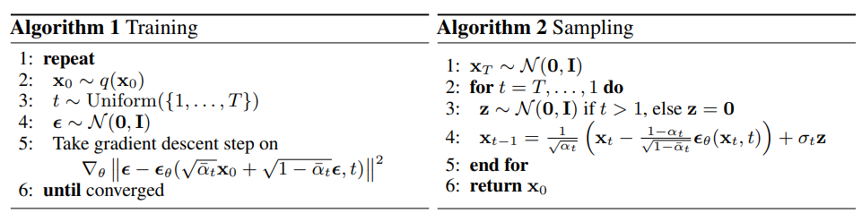 위에서 설명해 드린 DDPM은 아래의 pseudo-code로 전체 프로세스를 요약할 수 있습니다. 요약하고 보니 굉장히 간단해 보이네요.