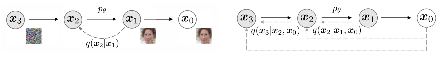 DDPM의 forward process는 $x_t$가 바로 이전 step 값 $x_{t-1}$에 의해 결정되는 Markovian Chain이지만, DDIM에서는 $x_t$가 바로 이전 step 값인 $x_{t-1}$와 첫 번째 값인 $x_0$에 의해 결정되는 Non-Markovian Chain입니다.