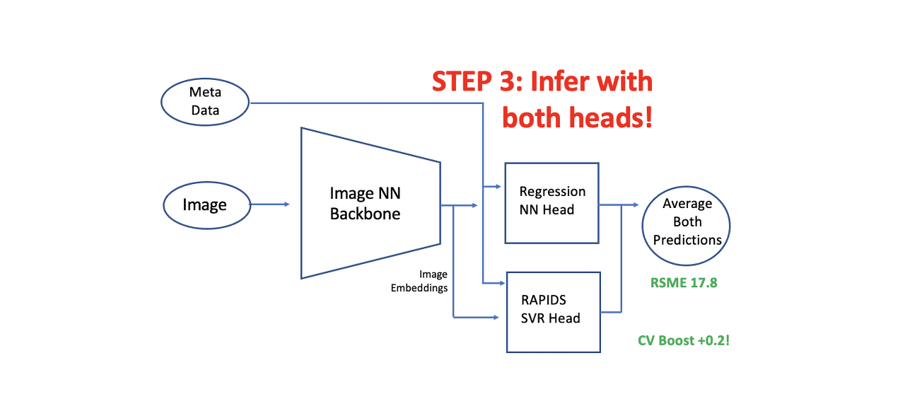 최종적으로 예측할 때는 Backbone으로부터 추출된 image embedding을 모든 Head에 통과시켜 결과 값을 뽑아내고, 예측치들의 평균을 최종 결과값으로 사용합니다. 이번 대회에서는 이 방법을 통해 약 1.3% 가량의 성능을 향상 시킬 수 있었습니다.