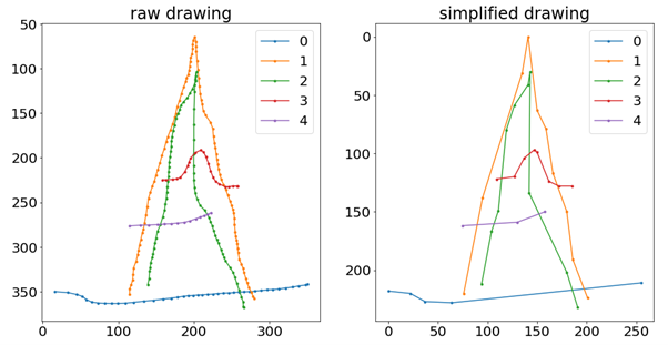 raw 파일의 drawing열 데이터와 simplified파일의 drawing열 데이터를 그려서 비교해 보면 다음과 같은 차이가 있습니다.