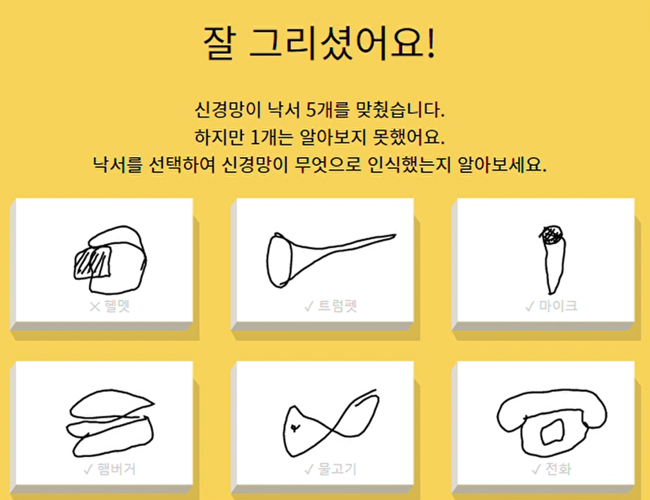 데이터를 좀더 구체적으로 이해하기 위해 직접 게임을 해보았습니다. 그림을 잘 그리는 편이 아닌데 아래 그림과 같이 모델이 상당히 정확하게 맞추고 있습니다.