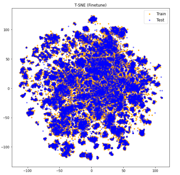 대회 막바지에 도착하면서 어떤 식으로 일반화에 대한 근거를 확보 할지에 대한 토의를 많이 하였고 아래그림과 같은 TSNE 시각화를 보며 Train과 Test의 분포가 닮았다는 것을 확인하였으며 validation의 분포에 맞춘 추론 전략을 그대로 적용할 수 있었습니다.
