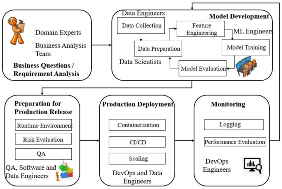 ML 라이프사이클의 시작은 사업화팀과 도메인 전문가에 의한 비즈니스 요구사항 분석에서 출발합니다. 요구사항에 기반하여 데이터 수집 방법을 결정하고, 데이터의 어떤 피처를 사용할지, 그리고 어떤 종류의 모델을 사용할지 등을 결정 하기 위하여 데이터 엔지니어, 데이터 과학자, ML 엔지니어등이 협업을 합니다. 프로덕션 배포 전에 소프트웨어 엔지니어, 데이터 엔지니어, QA 엔지니어가 협업을 해 릴리즈 환경에 대한 준비와 QA를 진행합니다. 프로덕션 환경 개발에는 DevOps 엔지니어, 데이터 엔지니어가 참여하며, DevOps 개발방법론에 기반하여 확장성, 보안, 신뢰성등을 만족하도록 개발을 수행합니다. 마지막으로 DevOps 기술에 기반한 지속적인 모니터링과 성능평가가 수행됩니다.