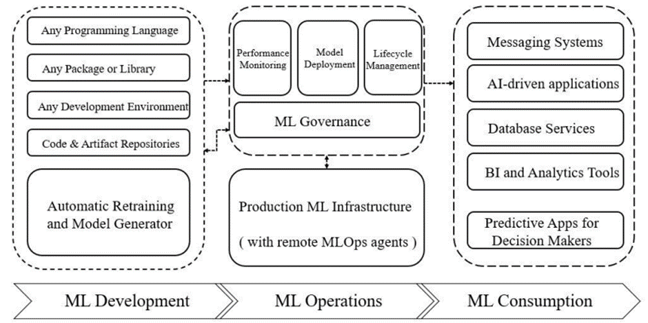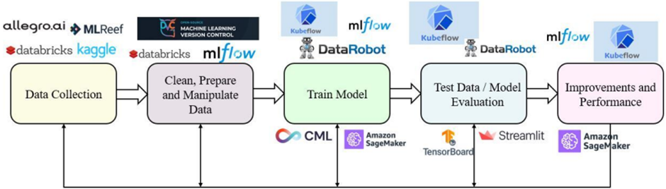 MLOps 플랫폼은 ML 라이프사이클을 쉽게 관리하고 빠르고 지속적인 배포를 지원 합니다. 아래 그림은 ML 라이프사이클의 각 단계별 필요한 기능을 제공하는 대표적인 MLOps 플랫폼의 예를 도식화 한 것입니다.