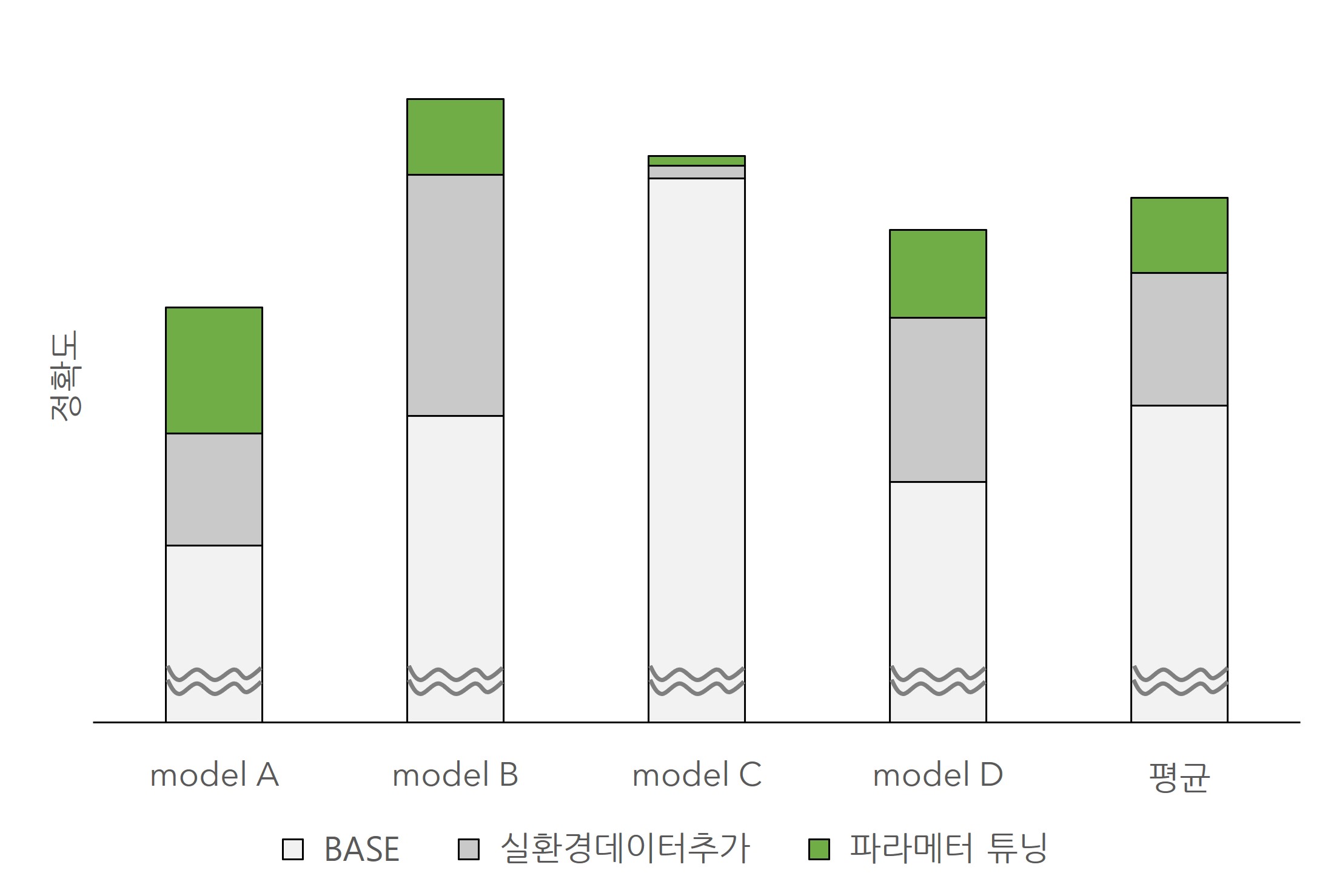 평균적으로 실환경 데이터 추가는 약 10%p, 하이퍼파라미터 튜닝은 약 5%p의 정확도 개선을 이루었으며 이는 Andrew Ng 교수님이 세미나에서 언급한 내용과 크게 다르지 않은 결과입니다.