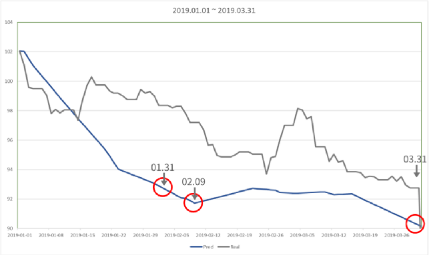 19년도 1분기 구매정보와 모델을 사용하여 구매한 시나리오를 비교해 보았습니다.