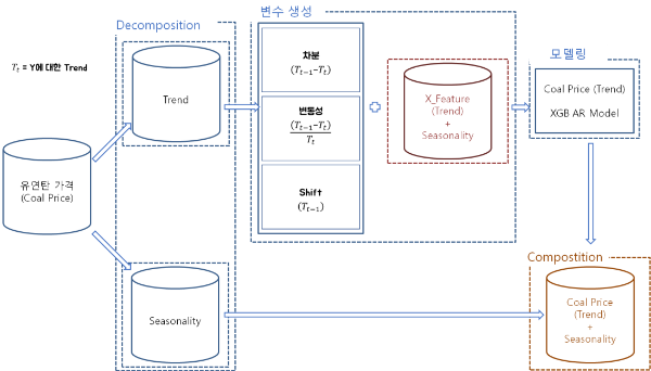 그렇게 형성된 X feature를 y인 Blackcoal price 예측을 하는 것에 사용합니다. 예측된 y에 y seasonality를 더해서 최종 예측을 진행했습니다.