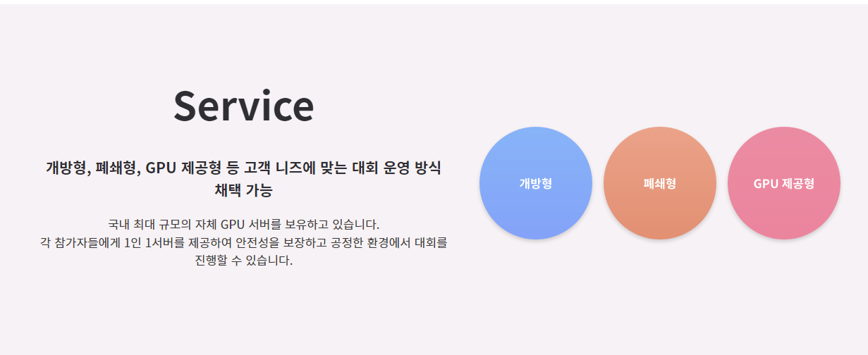 이는 AI 경진대회의 All process를 소화할 수 있는 국내 유일 플랫폼이라 할 수 있습니다. AI 경진대회 플랫폼을 통하여 구직을 원하는 취업준비생들과 우수한 기술력을 보유한 인력이 필요한 기업들의 니즈를 모두 충족시켜 줄 수 있습니다.