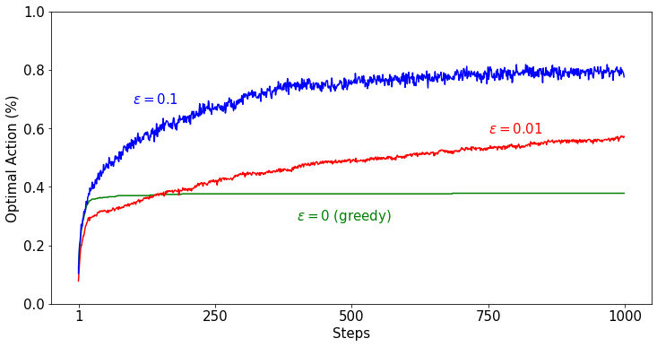 Greedy method의 경우 어느 하나의 Action이 초기값보다 커지게 되면 그 Action만 선택하기 때문에 Optimal Action을 선택할 확률은 어느정도 step이 지나면 수렴하게 됩니다. $\epsilon$-greedy method의 경우 Exploration으로 인해 시간이 지날수록 Optimal action을 찾게 되며, step 이 길어지게 되면 정확도는 약 $1 - \epsilon$ 으로 수렴하게 됩니다.