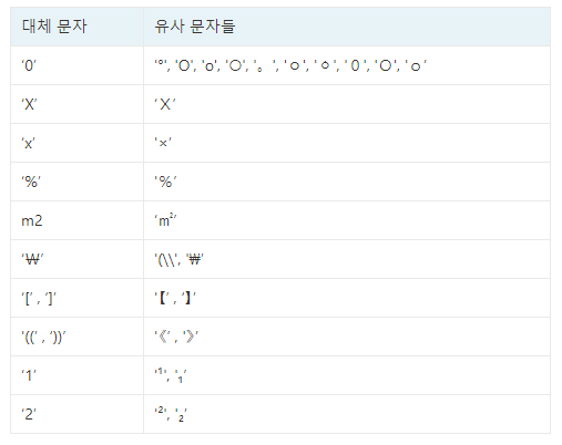 해당 경우를 제외하고도 제곱과 숫자 2, 대소문자X 와 곱하기 등 여러 경우가 있어서 다음과 같은 방법으로 유사 문자를 처리해주었습니다.