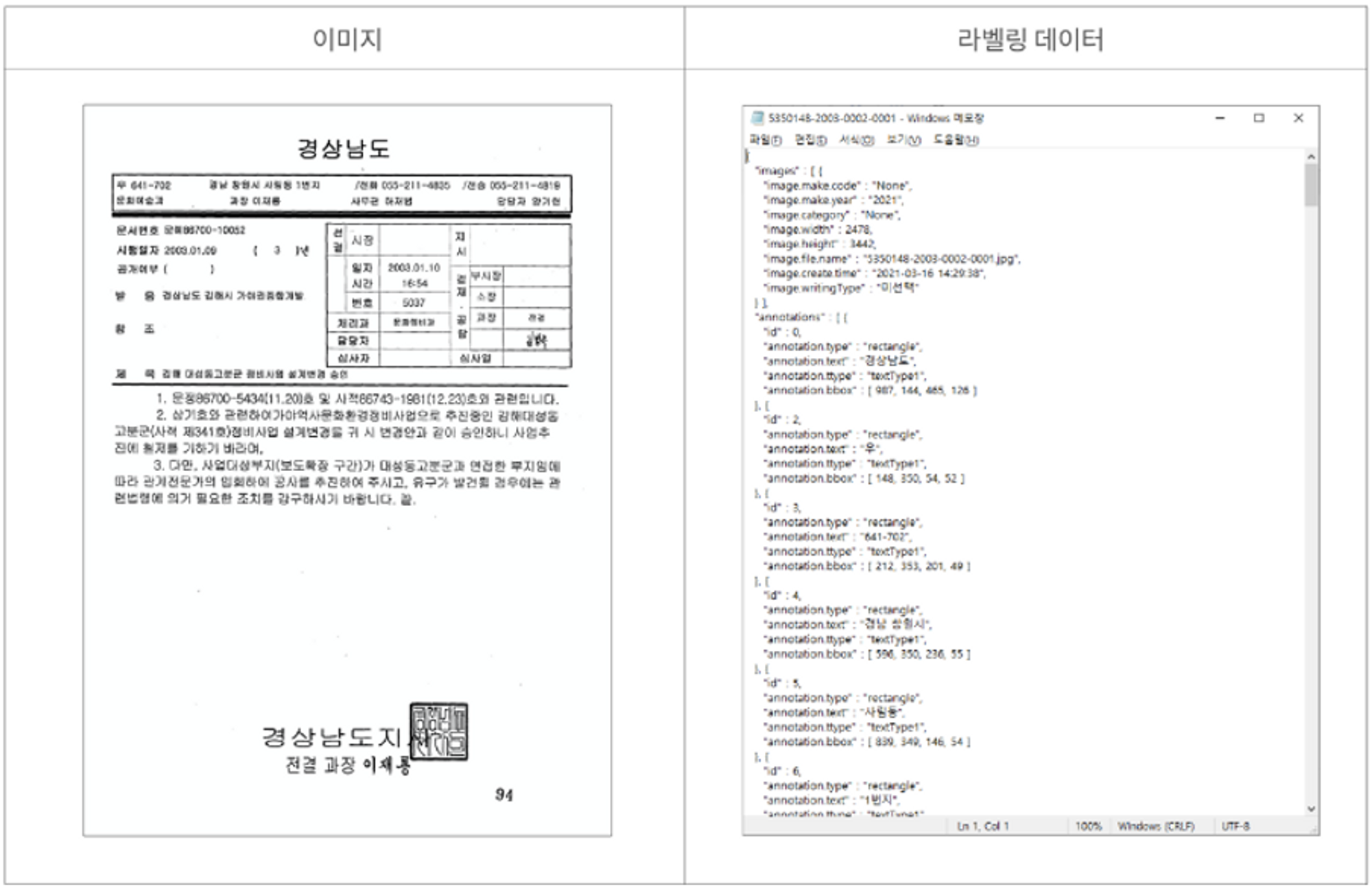 Label은 images, annotations 2개의 key로 구성되어 있으며, images 에는 행성문서 카테고리, 제작 년도 등의 사진의 기본정보가 담겨있고 annotations에는 문서 내 모든 단어의 bounding box와 해당 text가 담겨있습니다.