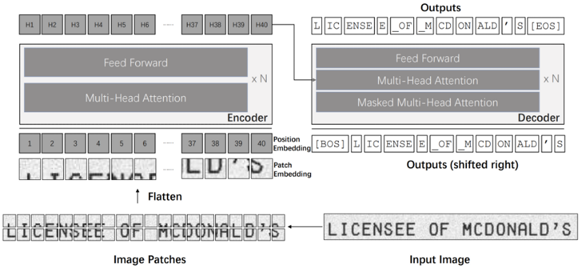 기존 모델의 복잡한 전, 후처리 과정을 개선한 Transformer 기반의 end-to-end text recognition 모델입니다. 기존의 text recognition task 에서는 CNN을 backbone 으로 사용하였으나, TrOCR에에서는 입력 이미지를 정해진 크기(patch)로 나눈 후 patch sequence를 만들어서 transformer에 적용해줍니다.
