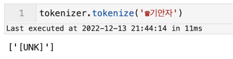 자주 틀리는 단어에 대해 tokenize가 되는지 확인을 해보았는데 한 단어 내에 vocab에 없는 글자가 포함되어 있으면 단어 전체가 [UNK] 처리 되는 것을 알 수 있었습니다.