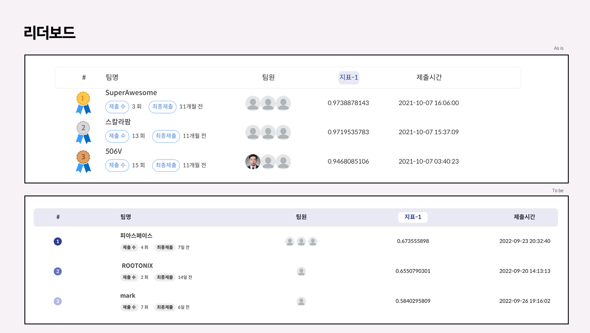 퍼블리싱의 경우 여러 업무가 있었지만, AI CONNECT 홈페이지의 리더보드 리디자인이 가장 기억에 남아요. 경진대회의 꽃이라 할 수 있는 리더보드의 기존 버전은 아이콘의 크기와 텍스트의 크기, 여백 등이 정리되지 않아서 정보 그룹을 명확하게 확인하기 어려웠습니다.