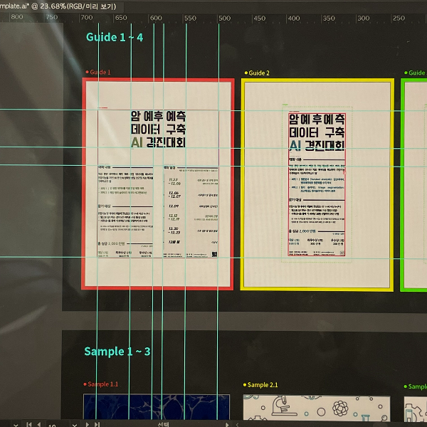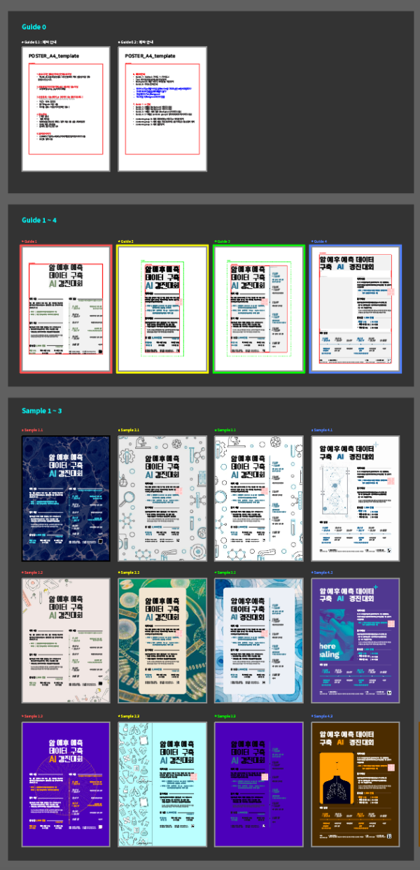 마지막으로 그동안의 디자인 작업물을 가이드/템플릿화 하면서 지속적으로 사용할 수 있도록 기준을 만들었습니다. 대회 포스터에 꼭 들어가야 할 내용들 ( 대회 개요, 과제 설명, 참가 대상, 상금, 대회 일정 ) 을 크게 두 그룹으로 나누어 1배열, 2배열, 2-1배열 포맷을 만들었어요. 그리고 이 가이드들에 따라 만들어질 수 있는 예시들까지 포함해서, 이후에도 다양한 버전이 나올 수 있게 정리했습니다. Contents group 1에는 대회 내용, 참가 대상, 총 상금을, contents group 2에는 대회 일정을 묶었는데요, 대회마다 적절한 레이아웃을 활용해서 다양한 형식의 포스터가 나오길 바라는 마음입니다. 😊