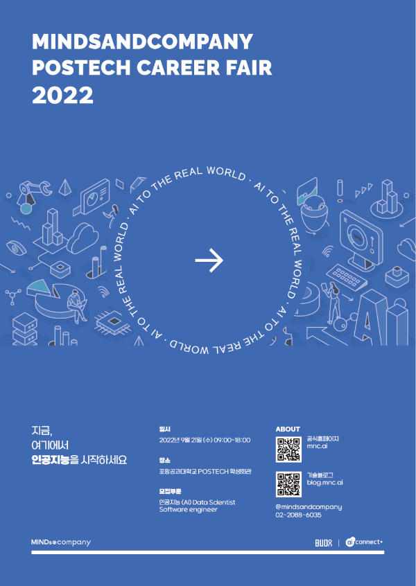포항공대 학생들에게 우리 MNC를 소개하는 자리로, 짧은 시간에 긍정적인 브랜드 이미지를 남길 수 있는 시각적 작업물을 만들기 위해 노력했어요. 인공지능의 전문성과 가능성, 그리고 친근한 이미지를 주기 위해 로고 컬러와 다양한 아이콘들을 조합하며 시안을 작업했습니다.