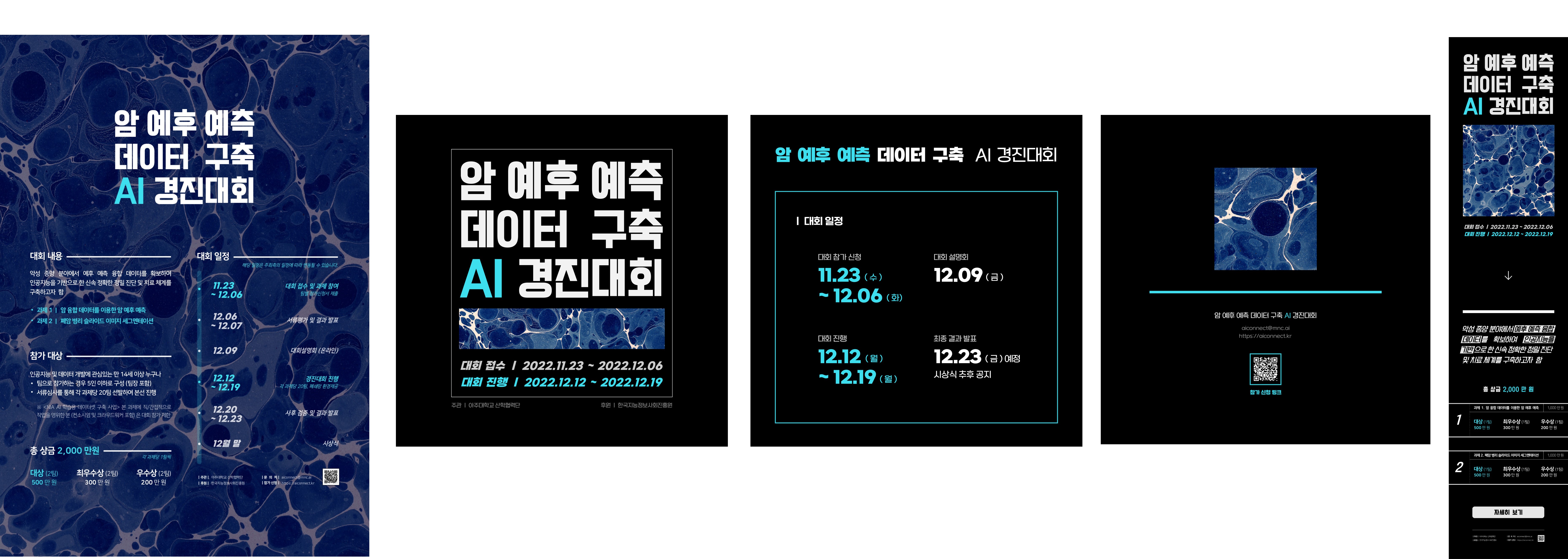 보통 포스터를 우선적으로 작업하고 포스터 컨셉에 따라서 홈페이지 메인 배너와 썸네일을 제작하게 됩니다. 예시로 “암 예후 예측 데이터 구축 AI 경진대회” 같은 경우, 암이라는 무거운 주제를 세포 이미지와 비슷한 물감 마블링 이미지로 풀어냈고, 이를 토대로 포인트 컬러를 설정하여 배너와 뉴스레터를 작업했습니다.