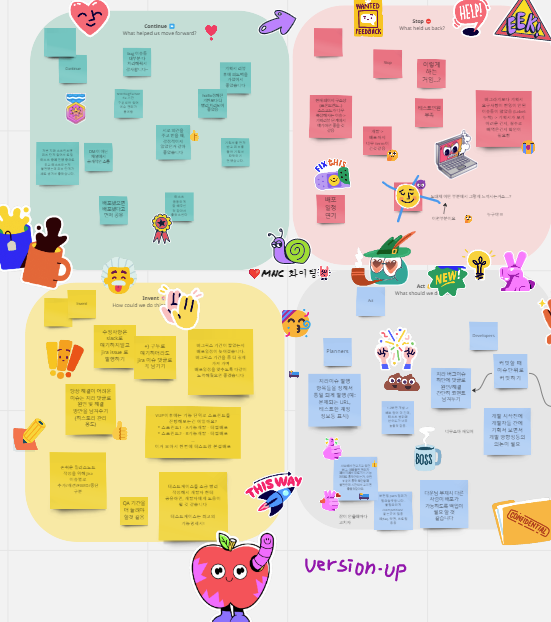 스프린트를 종료한 후, 기존에는 개선사항 정도만 나누던 회고 절차에도 변화를 줬습니다. miro라는 툴을 활용해 앞으로 더 해봤으면 하는 아이디어부터 애로사항과 이에 대한 나름의 해결책, 앞으로 무엇을 해야할지 구체적인 액션에 대해 적극적으로 & 자유롭게 의견을 개진할 수 있도록 한건데요. 각각에 대한 자신의 생각을 miro 툴 안에서 (익명으로) 메모 형태로 보드에 붙이고, 실제 회의 때에는 이 내용을 직접 대화로 풀어나갔습니다.