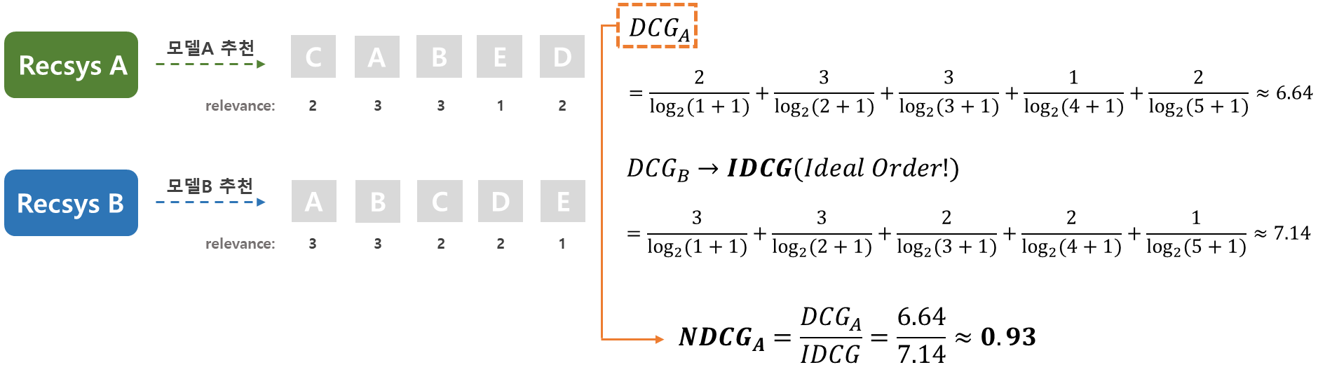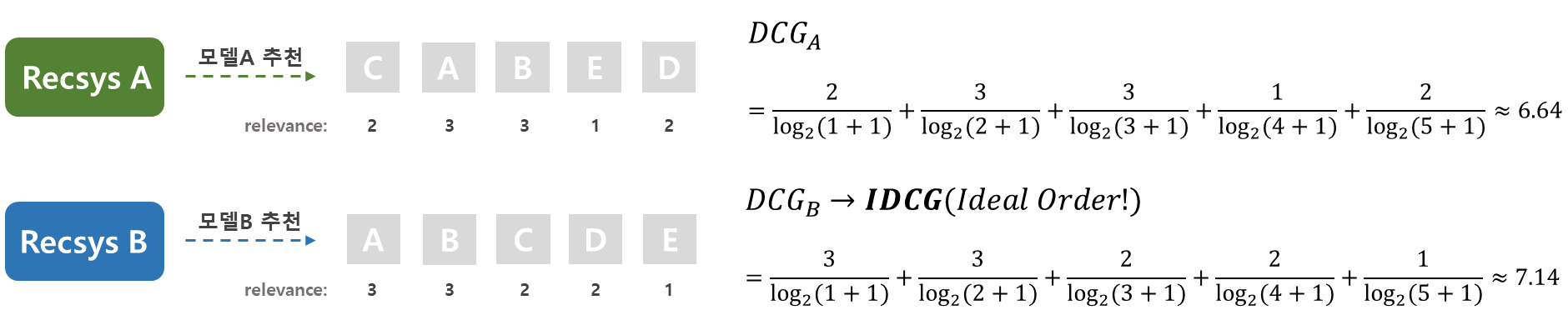 IDCG(Ideal DCG)는 아이템의 relevance가 큰 순서대로 배열하였을 때 나오는 최대 DCG 값을 의미합니다. 그림에서는 모델B의 결과값인 7.14가 아이템에 대한 IDCG 값이 됩니다.