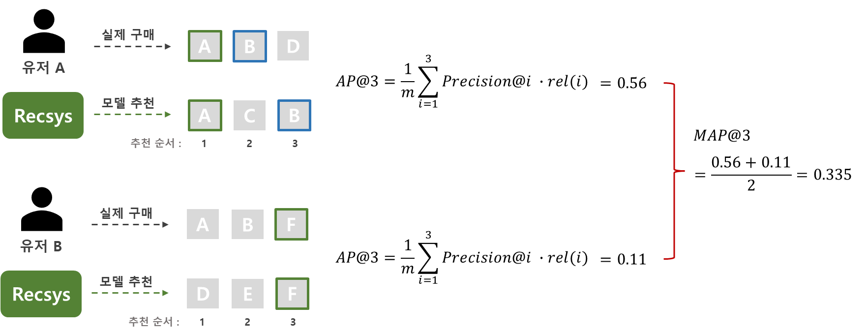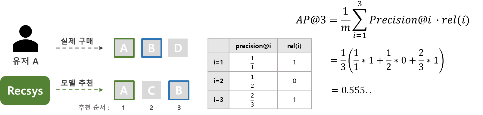 그림에서 모델은 순서대로 A, C, B 3가지 아이템을 추천 하였고, 이 중 사용자는 A, B 아이템을 구매하였습니다. 사용자는 모델이 첫 번째로 추천한 아이템 A를 구매 하였으므로, Precision@1은 1이 되게 됩니다. 이런 식으로 그림의 표와 같이 Precision@i와 rel(i)를 구하여 AP@3를 계산하면 약 0.56 정도의 값을 얻을 수 있습니다.