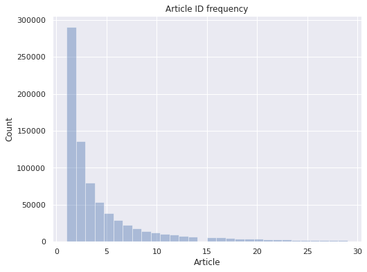 다음으로 각 session 별로 몇 번의 event를 포함하고 있는지 살펴보겠습니다. 아래 그래프의 x축은 세션에 포함된 event 수, y축은 세션 수를 나타냅니다. (event 수의 경우 30 미만으로 제한하였습니다.)