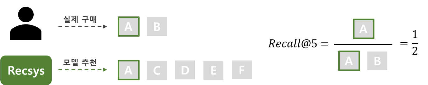 예를 들어, 실제로 사용자가 구매한 아이템은 A, B이고 모델이 이 사용자가 구매할 것이라고 예측한 아이템은 A, C, D, E, F 라고 생각해 봅시다. 이 때 사용자가 구매한 아이템은 2개(A, B), 이 중 모델이 추천한 아이템은 1개(A)이므로 Recall@5 = 1/2 = 0.5로 계산됩니다.