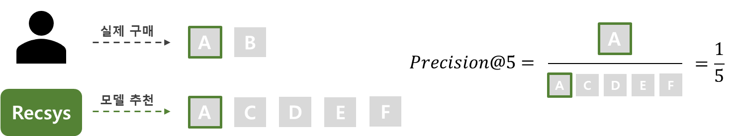 Precision@k는 ‘모델이 추천한 k개의 아이템 중 사용자가 관심 있는 아이템이 얼마나 포함되는지’를 의미합니다. 위와 같은 예시에서 모델이 추천한 아이템은 5개(A, C, D, E, F) 중 사용자가 실제로 구매한 아이템은 1개(A)이므로 Precision@5 = 1/5 = 0.2로 계산됩니다.
