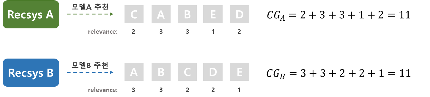 예를 들어, 어떤 사용자가 A, B, C, D, E 5개의 아이템을 구매하였고, 먼저 위치한 순서대로 사용자의 실제 우선 순위가 높다고 가정해보도록 하겠습니다. 모델A와 모델B의 결과를 보면 모델B가 먼저 위치한 아이템에 relevance score를 더 크게 부여 하였으므로 더 우수한 모델이라고 생각해볼 수 있으나, 두 모델의 CG 값은 11로 동일하므로 이를 통해서는 성능 평가가 불가능하다는 것을 알 수 있습니다.