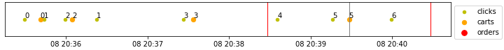 위 그림은 실제 세션을 나타낸 것으로 각 점은 이벤트이고, 가로 축이 시간입니다. 해당 유저는 0 ~ 6 아이템을 클릭 하였고, 0, 2, 3, 5 아이템을 장바구니에 담았습니다.