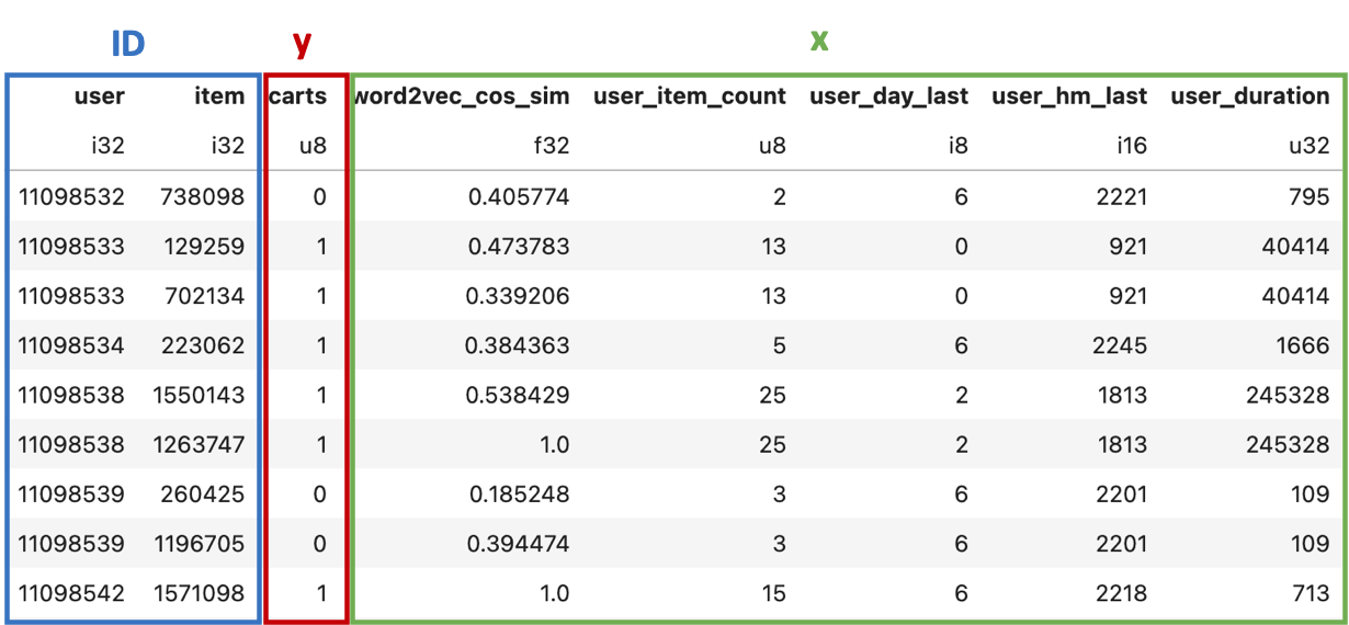 Ranker 모델의 학습을 위해서는 일반적인 지도학습 방식의 AI 모델과 마찬가지로 입력 값 x와 정답 값 y가 필요합니다. 아래 그림과 같이 어떤 유저가 Candidates Genertation 단계에서 추려낸 특정 아이템을 장바구니에 넣었다면 y값은 1이 되고 그렇지 않으면 0이 됩니다.