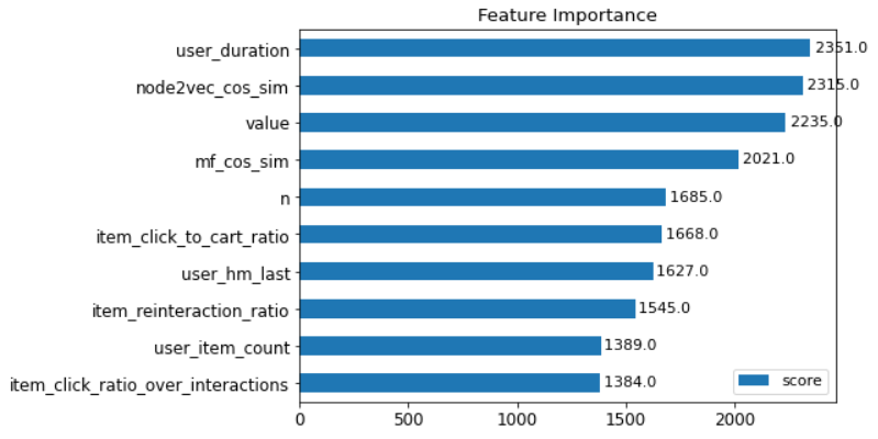 - Embedding 값간의 유사도를 피처로 활용하였으며, 세션의 마지막 아이템과 후보 아이템 간의 유사도 값이 일반적으로 가장 feature importance가 높은 것을 확인할 수 있습니다.