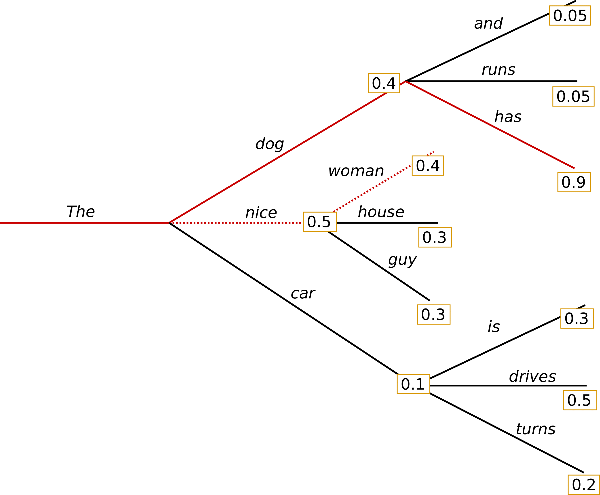 (The, nice) 이후에 이어질 단어로 woman이 선택되는 이유 역시 모델이 해당 분기에서 예측한 가장 큰 확률의 단어가 0.4의 확률값을 지닌 woman이기 때문입니다. 앞서 말한 바와 같이 이와 같은 방법은 매우 직관적이며 많은 상황에서 매우 효과적입니다.