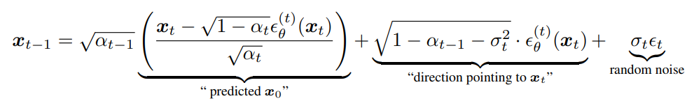 DDIM에서 reverse process는 noisy한 $x_t$에서 $x_0$를 예측한 후, 이것과 reverse 조건부 분포 $q_{\sigma}(x_{t-1} | x_t, x_0)$ 활용해 $x_{t-1}$을 구합니다.