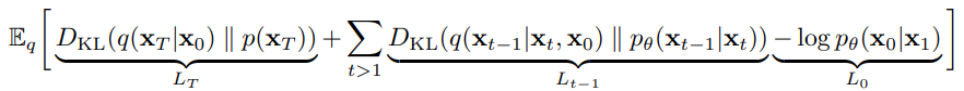 여기서 DDPM은 $\beta_1,\dots\beta_T$를 상수로 정의해 Forward Process의 objective 함수인 $L_T$에서도 학습 파라미터가 사라지며 고정값을 가지게 됩니다. 이렇게 크게 loss function의 세 개의 항 중 하나를 상수로 바꾸었습니다.