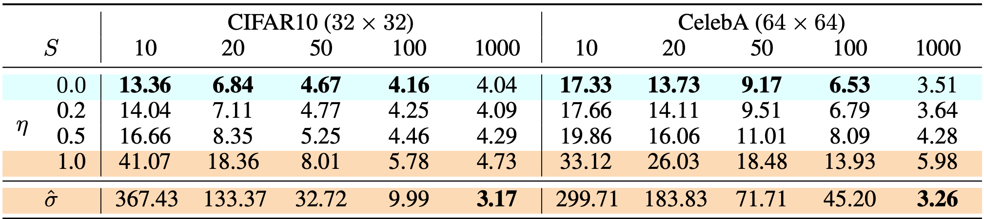 이렇게 진행하는 단계를 줄였다면, 성능 저하는 자연스럽게 따라오는 걱정이겠죠. 하지만 아래 표에서 $\eta=0.0$과 $\eta=1.0$은 각각 DDIM, DDPM 을 의미하는데, 진행한 샘플링 step 수인 S가 특히 작을수록 DDIM의 성능이 더 좋은 것을 볼 수 있습니다. 이때, 논문에서 DDPM Reverse Process 실행 시 더 큰 노이즈 $\hat{\sigma}_t = \sqrt{(1-\alpha_t/\alpha_{t-1})}$을 부여하는데 이는 CIFAR10 데이터셋을 생성하는 데만 이 기법을 활용했다고 하네요. 또한, $S=1000$에서 DDPM의 성능이 더 높은 예외 상황이 발생하긴 하지만, DDIM의 경우가 샘플 수에 따른 성능 개선이 균일한 것을 확인할 수 있습니다.