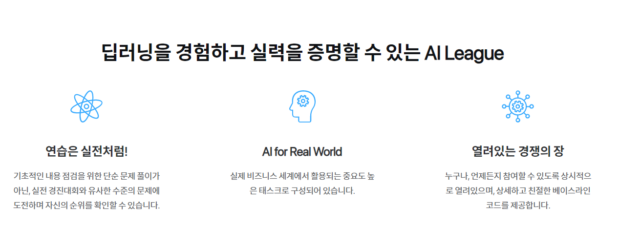 AI League는 기존 경진대회와 채점이나 점수 산출, 리더보드 순위 표기 등 주요한 기능은 동일하지만,
