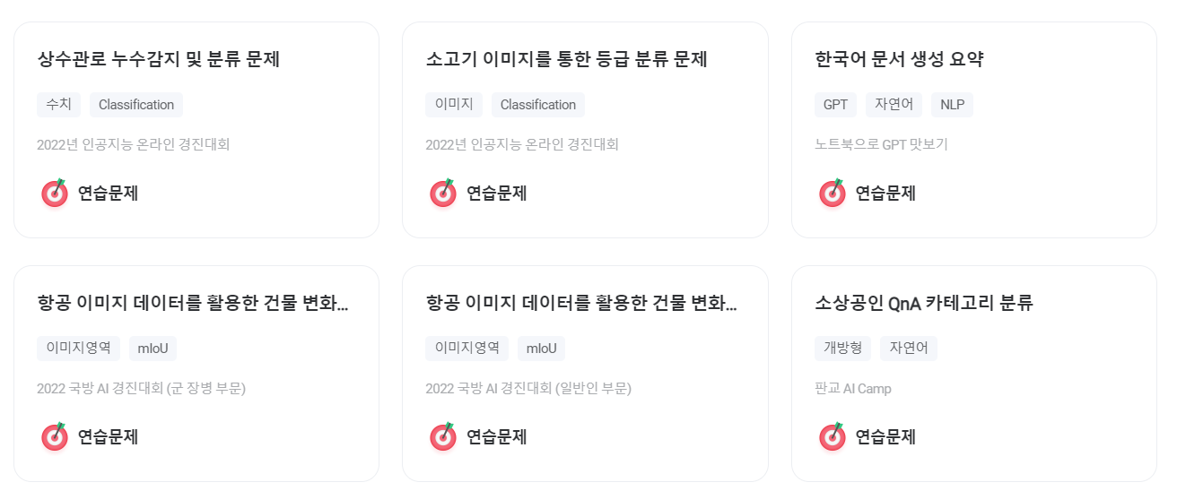 이 과정에서 여러 사용자들의 반응을 서치해보니, 시중에 나온 학습용 모의 경진대회는 아주 기초적인 수준과 내용만을 다루는 단순 문제 풀이가 대부분이라 아쉽다는 평이 많았는데요.