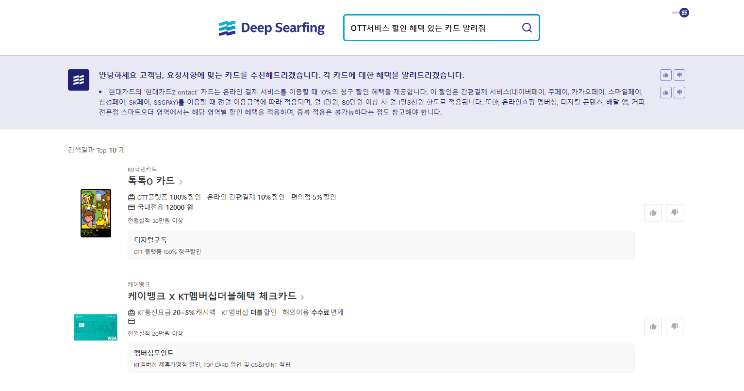 오늘의 예시를 통해서 딥서핑 기능을 확인해 보자면, 필요한 정보가 검색 키워드에 포함되어 있지 않더라도 의미를 확장시켜 기술된 어휘에 의미에 가장 알맞은 문서를 추출해 줄 수 있습니다. ‘OTT 할인 혜택이 가장 큰 카드’라고 검색할 경우 OTT 서비스에 포함된 넷플릭스, 왓챠, 티빙 등의 개별 OTT 중 하나라도 혜택을 보유한 카드를 추천해 준다는 뜻입니다.