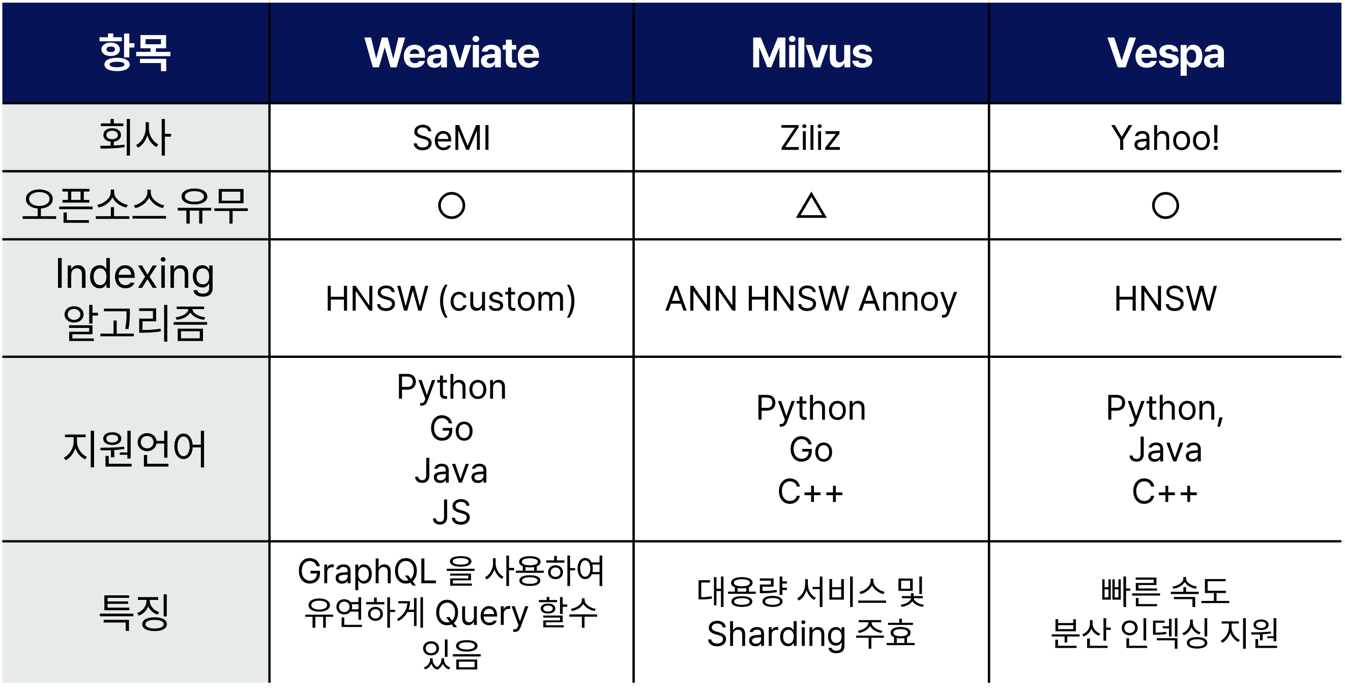 Vector DB는 다양한 기업 및 오픈소스 커뮤니티에서 다양한 기능과 특징을 가지고 제공되고 있으며, 대표적인 Vector DB들의 리스트는 아래와 같습니다.