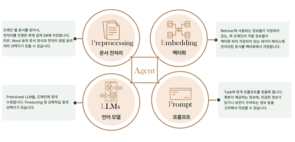 ‘AI 서비스 빌더’가 이때 문서에 맞는 전처리 옵션과, 임베딩 옵션, 사용할 LLM 옵션, 프롬프트 옵션 등을 각 부서마다 맞춤형으로 제공하게 되고, A 회사는 부서 별, 도메인에 맞는 AI Agent를 얻게 되는 것이죠! 이 경우에 옵션이라는 것은, 사용할 LLMs, API, SDK, Embed 방식 등을 포함합니다.